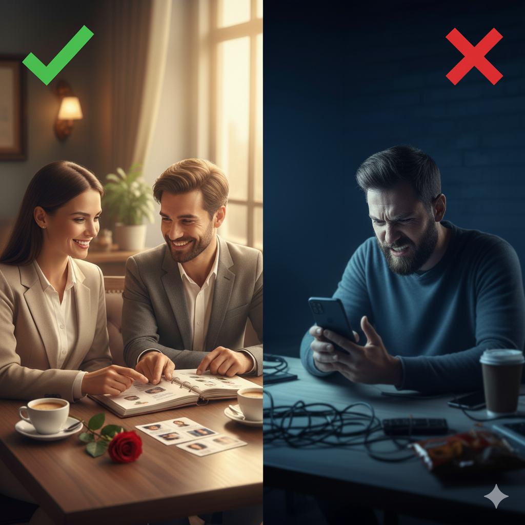 Wer nur online sucht, erlebt oft Swipe-Müdigkeit, leere Versprechen und unpassende Kontakte. Die Offline-Vorauswahl von Liebevoll vermittelt filtert vorab Identität, Absichten, Werte und Lebensstil – damit Sie weniger chatten und mehr ankommen: bei echten Menschen, die wirklich zu Ihnen passen.